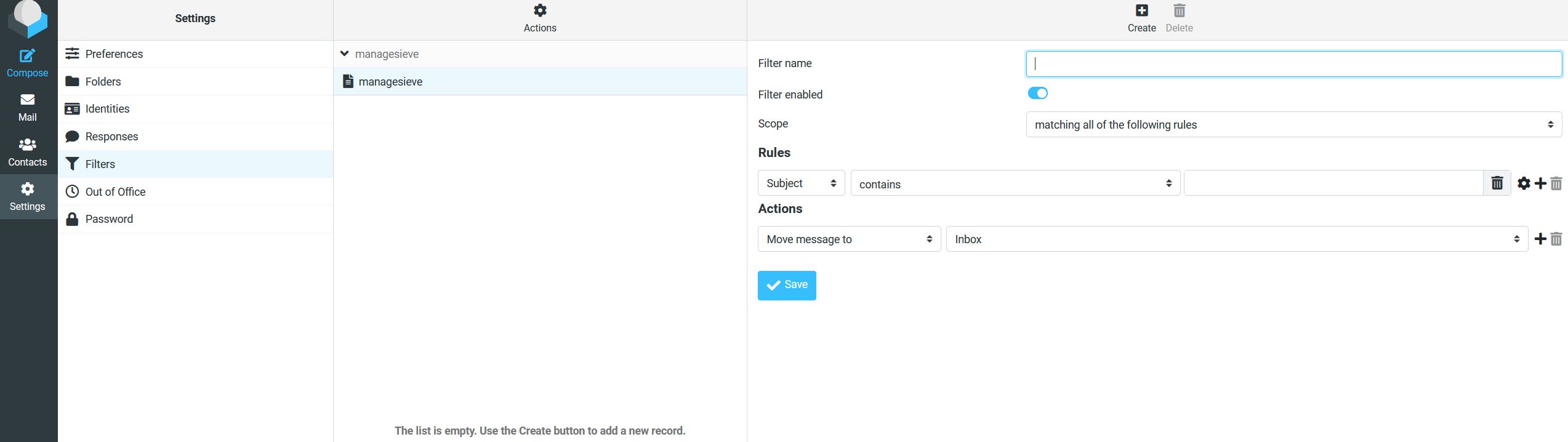 Azonban a felhasználói e-mail fiók jelszavának ismeretében ott is lehetőség van ún. Sieve filter hozzádására, amely hasonló funkciókat láthat el, mint a cPanel esetében. A legnagyobb probléma, hogy ezeknek a filtereknek a hatása a cPanellel ellentétben nem láthatóak az E-mail Követés menüpontban.