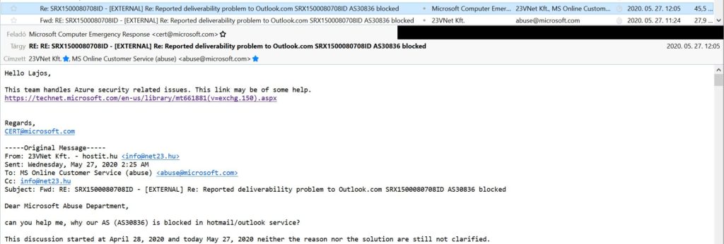2020.05.27 -én jeleztük problémánkat az abuse@microsoft.com -ra küldött e-mailben. A megkeresésre a cert@microsoft.com válaszolt, amelyben tájékoztattak arról, hogy ők az Azure biztonsági kérdésekkel foglalkoznak, továbbá megtekinthetem a